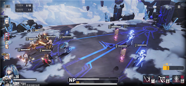 战斗玩法2:采用了全局资源运作的ATB回合制战斗机制。敌我角色在战斗中的行动顺序由速度属性决定。每个角色在战斗时都有普攻、小技能和大招3种基础战斗方式。使用普攻能够获取全局战斗资源NP。各个角色使用小技能和大招时直接消耗全局资源NP,且没有技能CD。只要攒够NP,我们就能在战斗时通过大招连发打出一连串的爆发伤害。