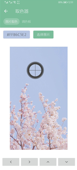 4、通过取色器功能,上传图片并点击任一点,查看该处的色号。