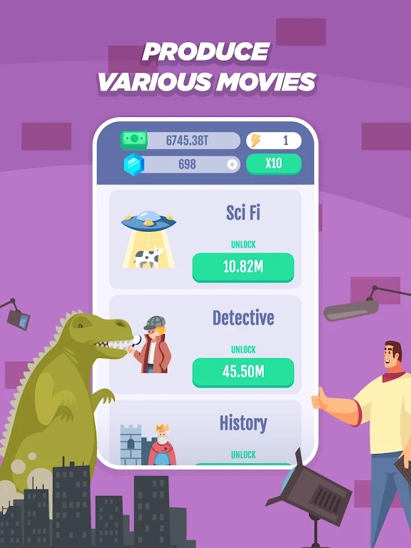 空闲电影工作室是一款很不错的电影制作的游戏,玩家在游戏里面来进行经营一家电影制作公司,去尝试拍摄各种不同的良好的片子,你拍摄的片子得分越高你获取的收益越多,去选择合适的演员选择合适的剧本来拍摄,努力的制作更好的电影来进行使用,在游戏里面有很多的不同拍摄乐趣的尝试,玩家可以赚取更多的收益来扩大自己的经营规模,尝试这些欢乐的经营趣味体验。