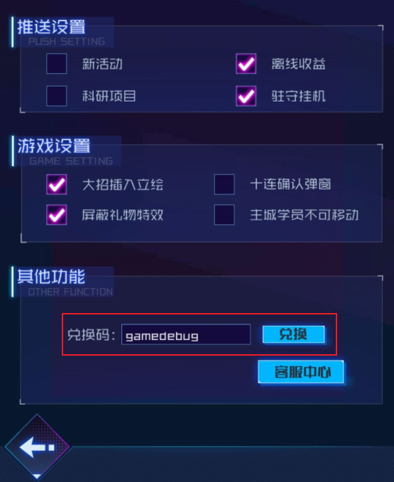 3、 在设置页面中找到“兑换码”一栏。在此输入特定代码:“gamedebug”(意为“游戏的漏洞”),然后点击确认或兑换按钮。