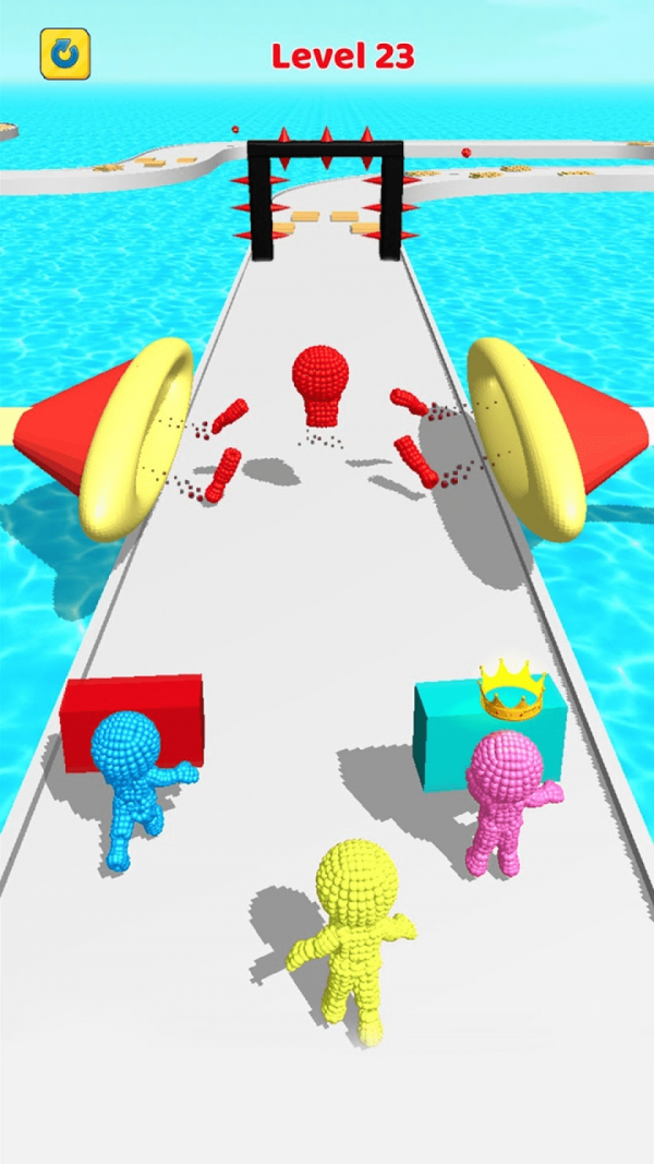 1.控制像素人收集更多木板,在正确的位置靠近,并在弯道上超车;