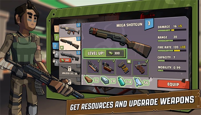1.一款全新刺激的3D卡通风格的后启示录生存射击游戏,独特的复古像素风格;