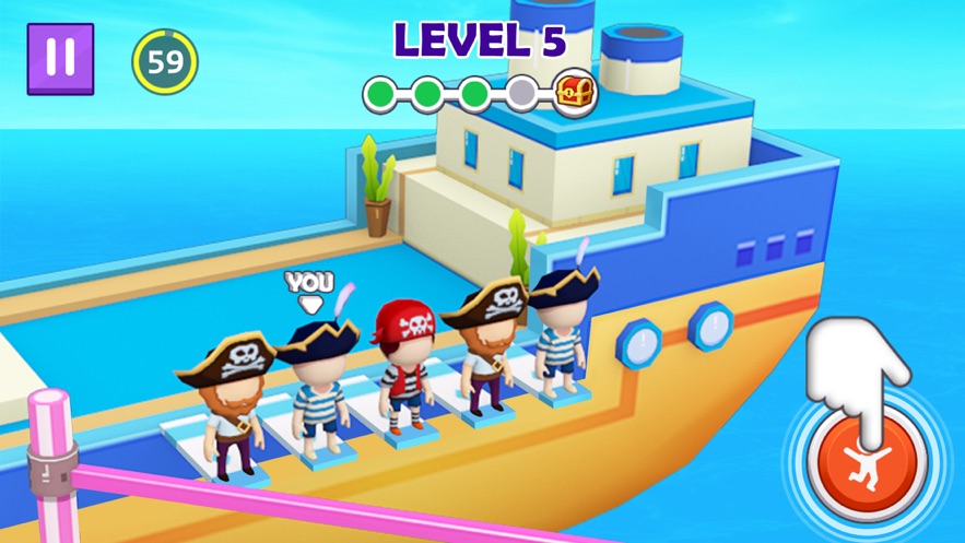 3、这款游戏是一场手速和反响的竞赛,捉住全部时机准确地越过障碍物赢得竞赛,游戏中玩家将会与其他的四名玩家一起站在船的甲板上。