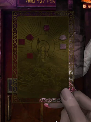 4、点击地藏王屏风前的供桌,按照无字谶的线索将供桌左侧的花灯和红烛关灭,寿桃全部点亮,香炉中左侧的香熄灭;这样就可以获得僧人雕像和一个齿轮。