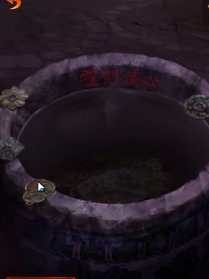3、接着按照纸人接待员身后门上的图案,点击水缸,将五枚花钱按照图案的顺序(从下往上)丢到水缸中激怒可以进入地藏殿。