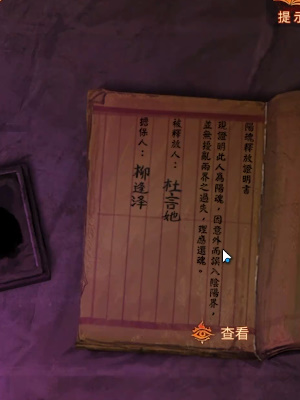 11、返回阴阳牢使用毛笔在狱卒面前桌子上的书本上写上释放杜言她,获得杜言她的照片。