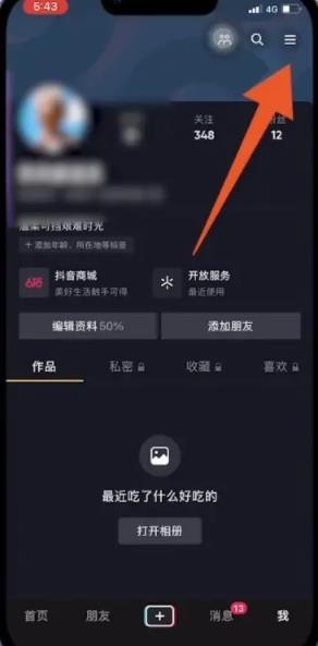 1、进入抖音我的页面后,点击页面中右上角的【三条横线图标】;