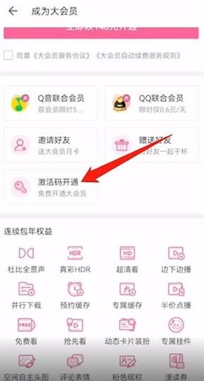 3、接着点击页面左上角的【开通大会员】按钮,进入【成为大会员】页面,再下拉页面点击【激活码开通】选项,进入【大会员激活码】页面,