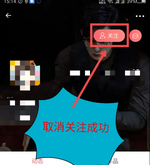 在用户详情界面,点击袭汽顶部的已关注三个字。如图所示