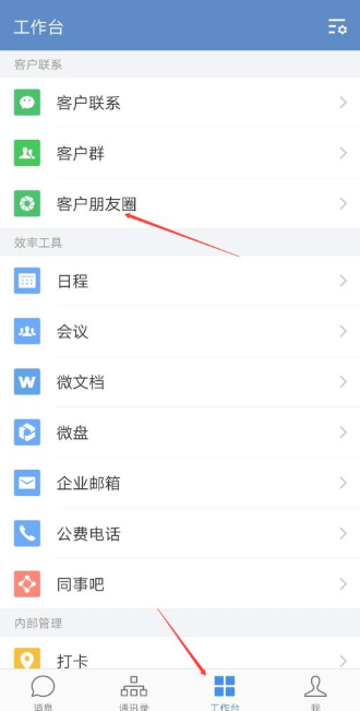第二步,打开并登录企业微信,切换到‘工作台’菜单下,找到‘客户朋友圈’,如下图所示: