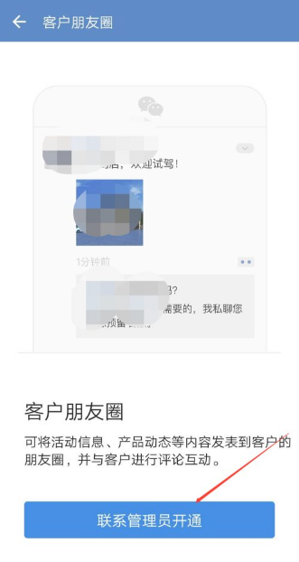 第三步,点击‘客户朋友圈’,如果还么有开通则需要联系管理员开通。如下图所示: