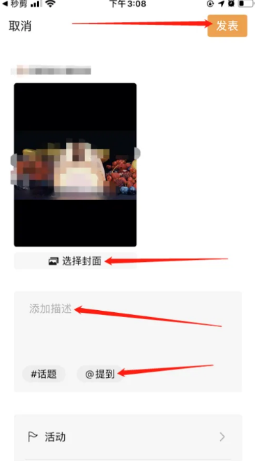 选择封面,添加描述和话题,发表即可!