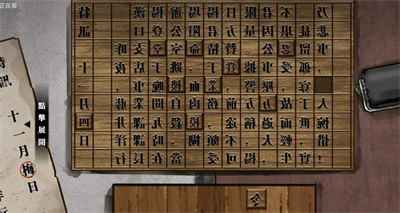 1、进入游戏后和在最左侧的桌子进行互动,发现一张纸,找到上面的所有错别字,复原铅字印版,从左到右从上至下为:四、堂、楼、命、模、赏、力、忍、令。