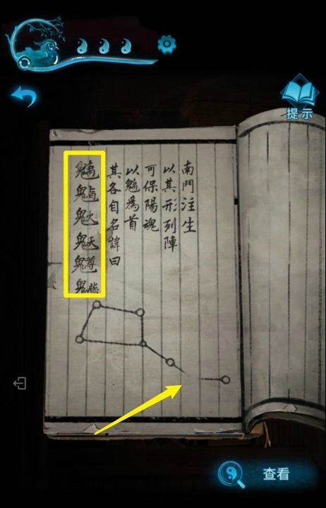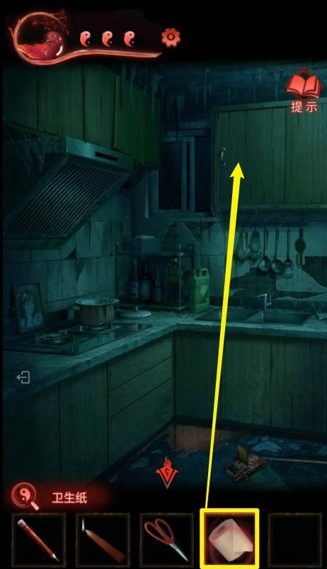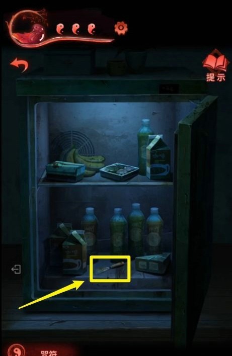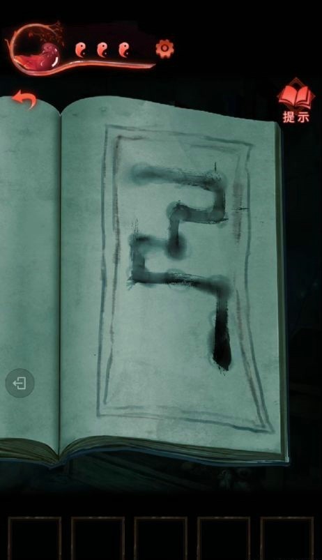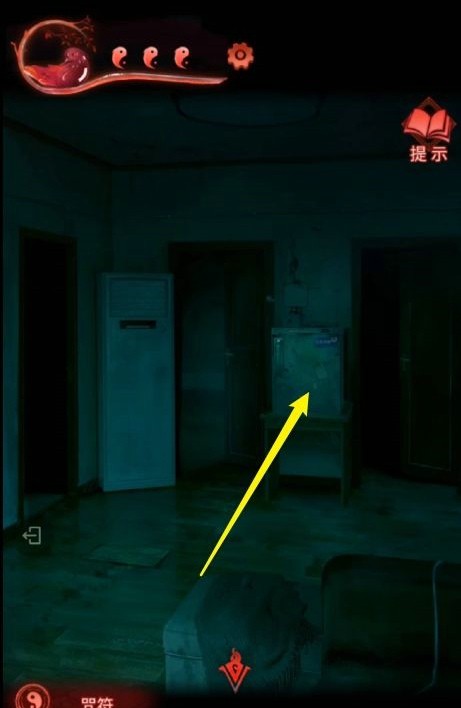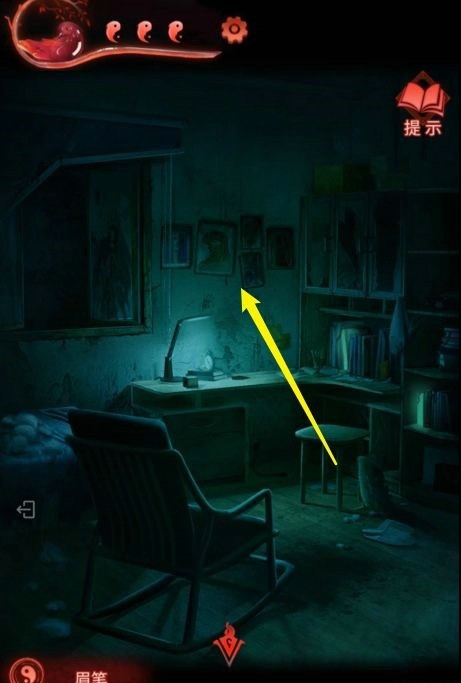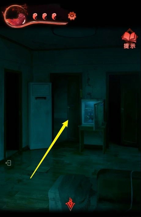 12、来到客厅后面,点击冰箱左边的门,将【符咒】贴在门上,使用【眉笔】根据卧室书中的线索画符(如图62.1),进入书房。