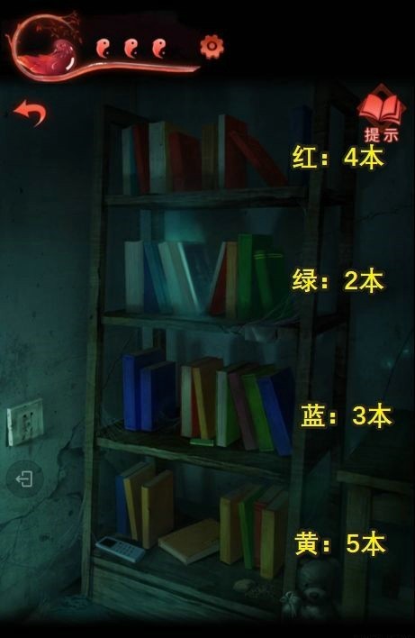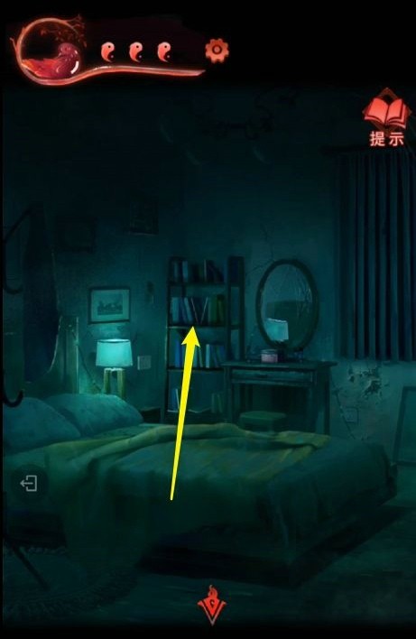 10、来到卧室,点击左边书架,跟据【一张纸】上正面的线索,得到数字:4235。