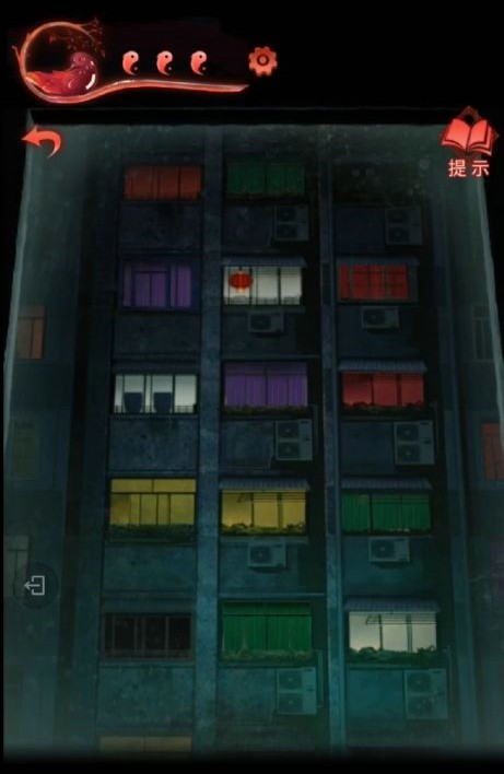 3、观察物品栏中的纸张线索,点击观看背面,对照大楼的灯光,得到线索:红、红、紫、黄、绿、白。