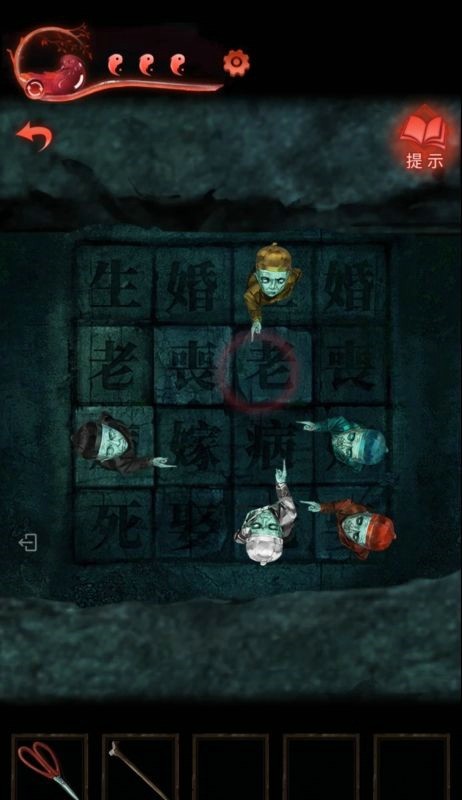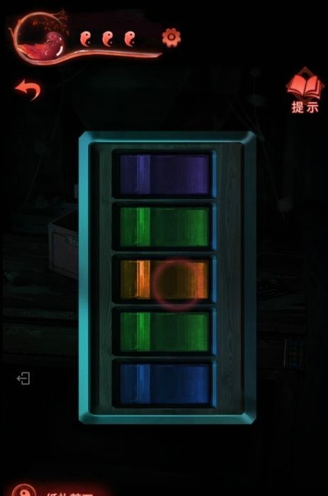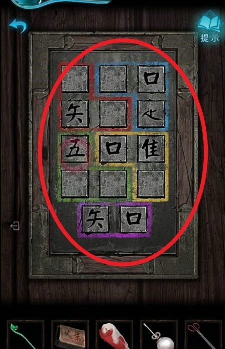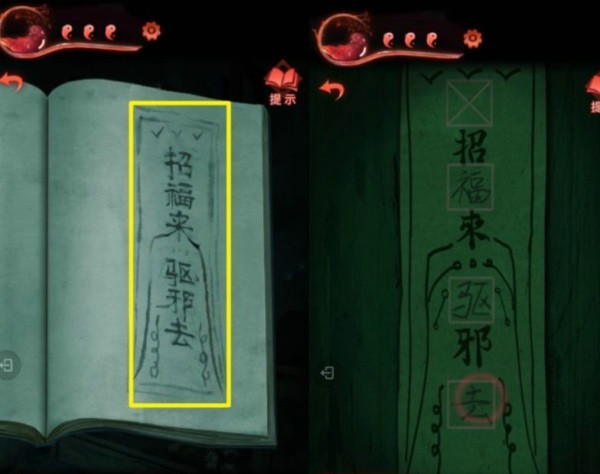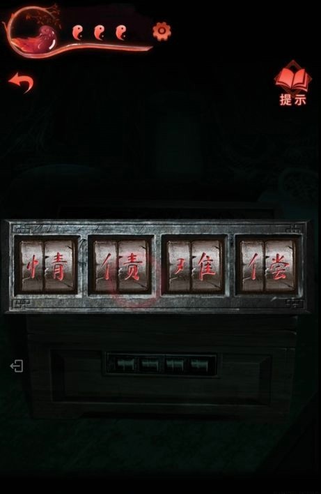 40、来到宗祠门口,点击门口的箱子,按照上面的线索,将不同颜色的框框内改成对应的字(小游戏难度不高,每个框中有两个字,上面一排的阴阳按键可以调整相邻两个框中后面的字,下面一排阴阳按键可以调整同一个框中前后两个字)。