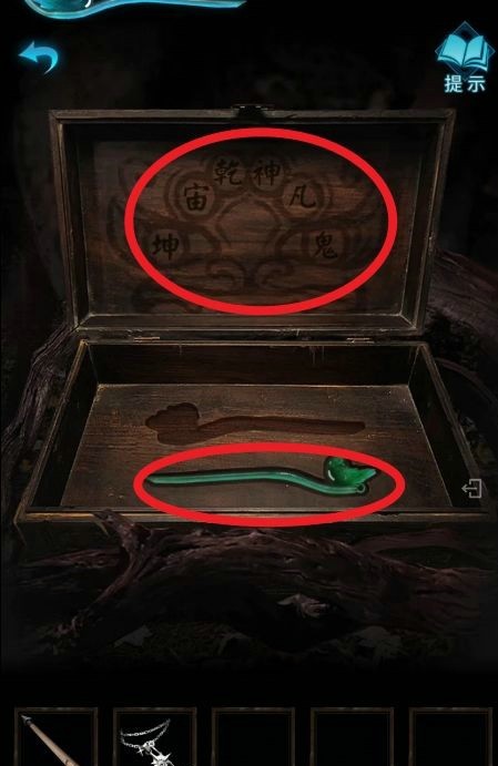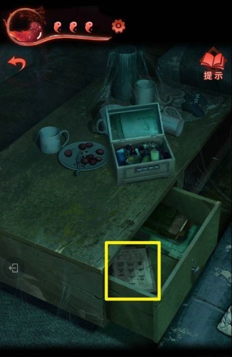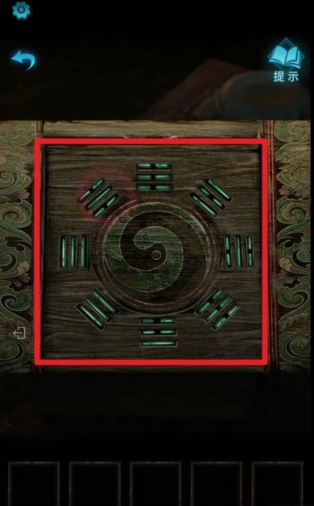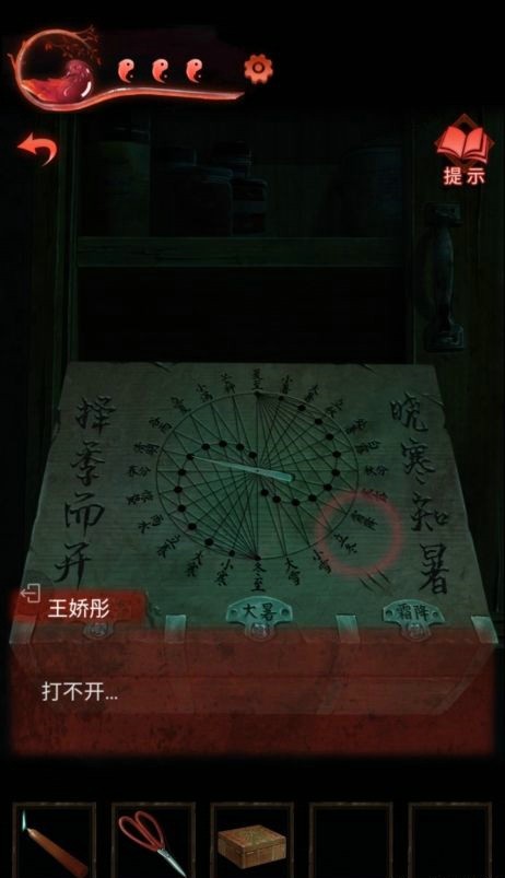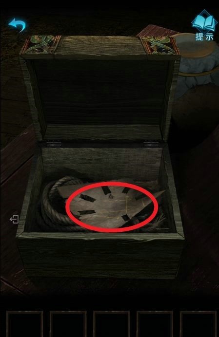 23.返回屋内,点击桌子上盒子,按照古镜中的提示变动箱子上的符号,如图所示打开箱子,之后得到一张有破洞的纸。
