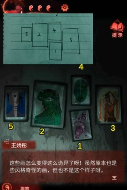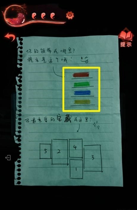 13、观察书房墙壁上的照片,根据【一张纸】正面的数字线索得到:1紫色、2绿色、3黄色、4绿色、5蓝色。
