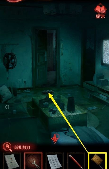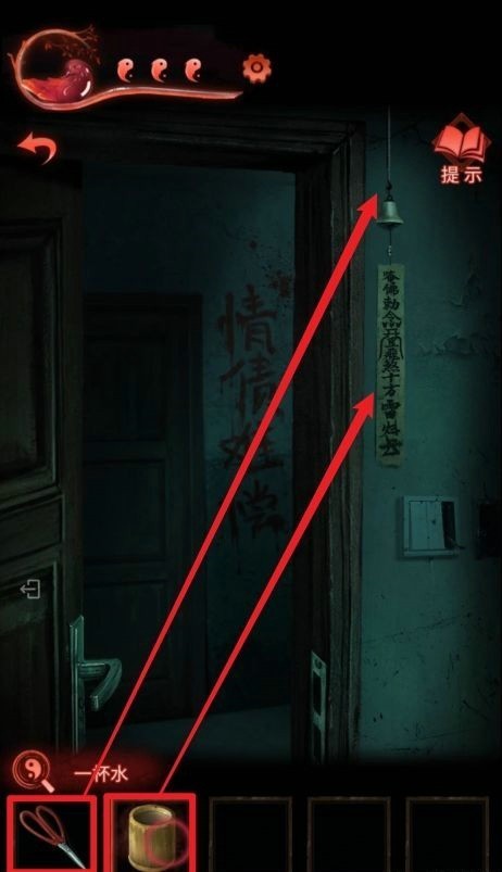 30、前往前面客厅的门口,使用【一杯水】破解符咒,剪刀剪断风铃,进入剧情,第三章结束。