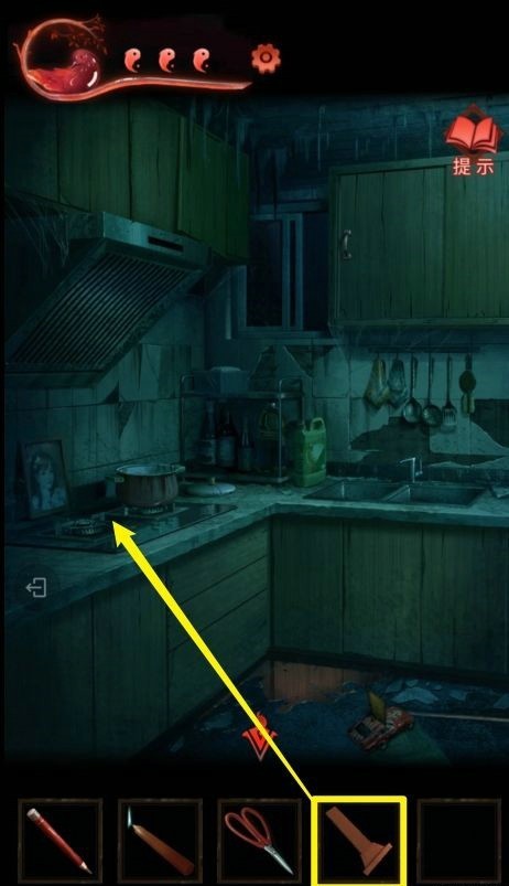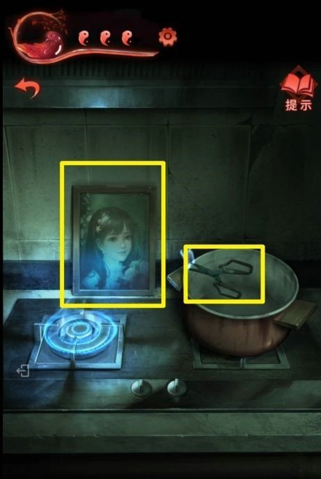 20、来到厨房,将【照片】,摆在灶台上,点燃【纸剪刀】,得到【剪刀】。