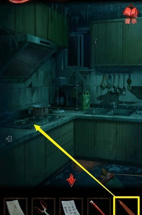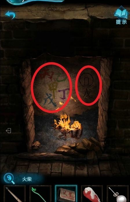 12.点击下方的灶台,将右边的【火钳】收集起来,把木像扔进去用火柴点燃,火光照亮灶台内部,将暗号记录下来。