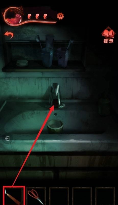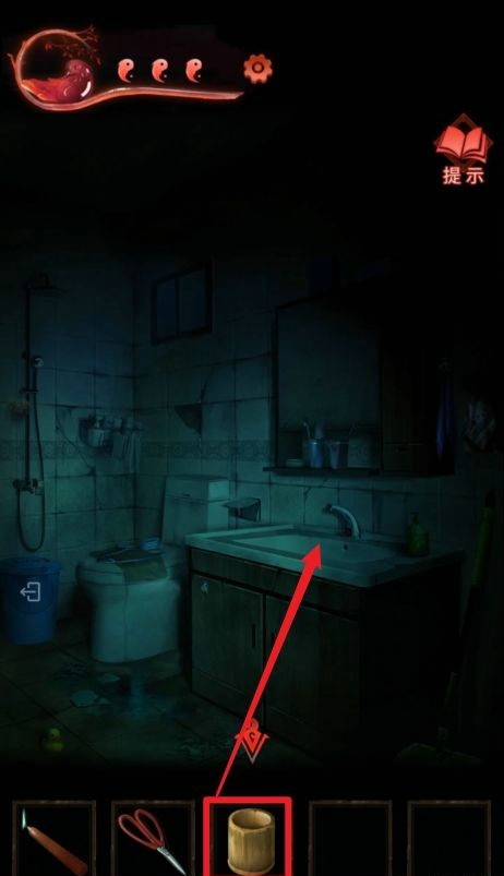 29、来到卫生间,点击水池,使用【竹杯】接水,然后使用【燃烧的蜡烛】触发感应,得到【一杯水】。