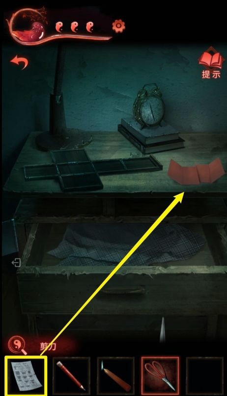 点击客厅桌子上的盒子,输入“情债难偿”,打开盒子,得到【纸剪刀】。