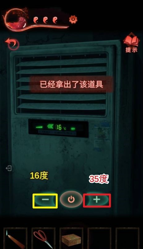 28、来到后面客厅,点击空调,将空调开到最小(16度)点亮“惊蛰”,将空调开到最大(35度)点亮“大暑”,将箱子拿到冰柜处,点亮“霜降”,打开盒子得到【竹杯】。