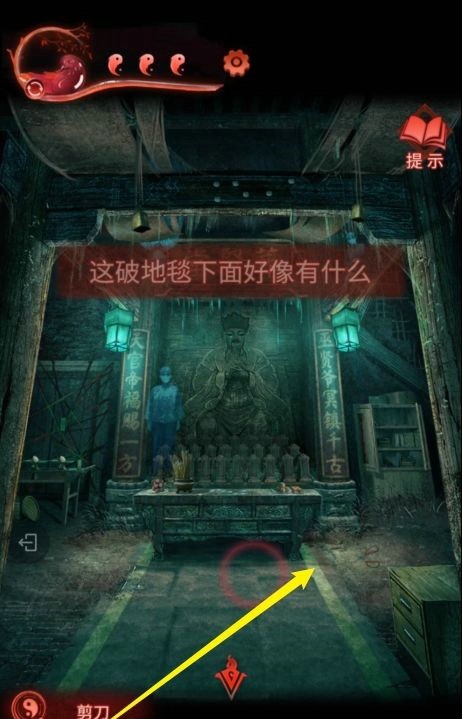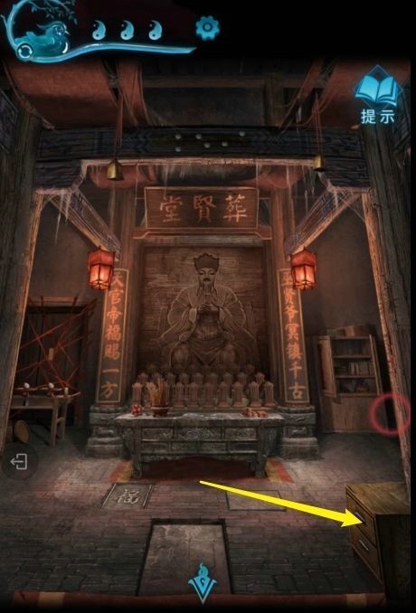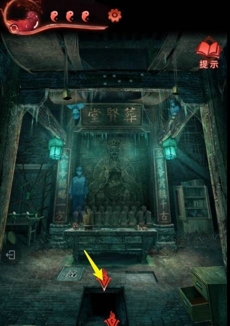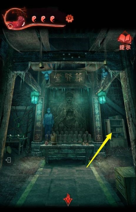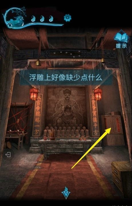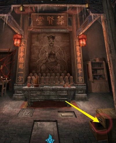 35、回到宗祠,点击雕像左边的祭坛,将【阳喜字】放入凹槽。