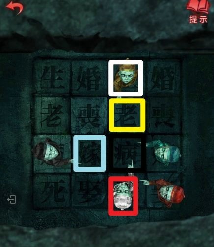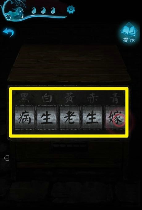 15、进入宗祠,点击右边的箱子,在下面的密码锁中输入密码:黑-病、黄-老、红-生、白-生、青-嫁,得到【磁勺】。