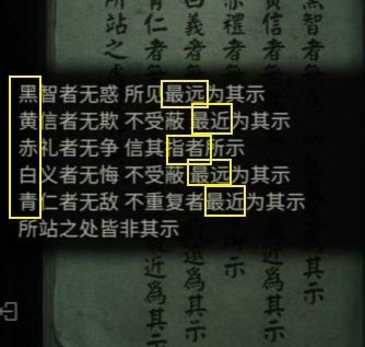14、参考《寿祭》中的线索(黑人能够看到的最远的字-病,黄人看到最近的字-老,红人相信所指的人指向的字-生,白人不受遮挡对应最远的字-生,青人最近的不重复的字-嫁),对比图片93.1,得到密码:黑-病、黄-老、红-生、白-生、青-嫁。