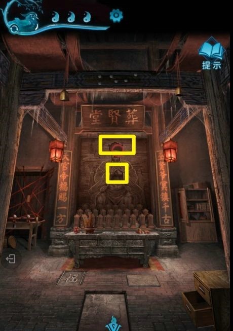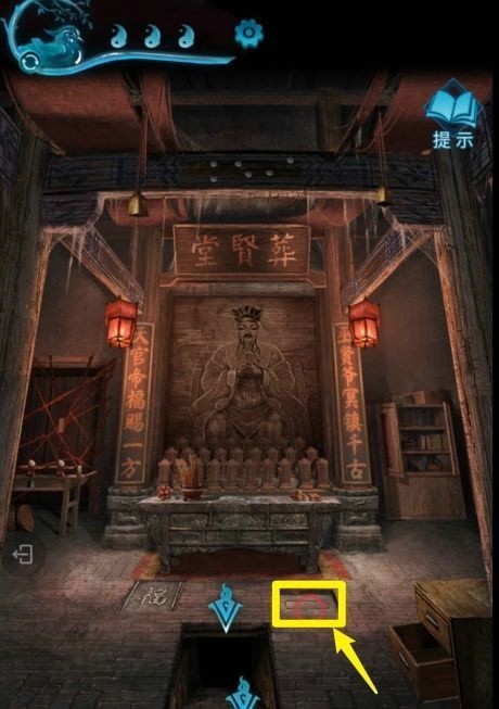 18、进入宗祠,将【石笏】和【石冠】放在正中央的雕像上,打开地下通道的机关。