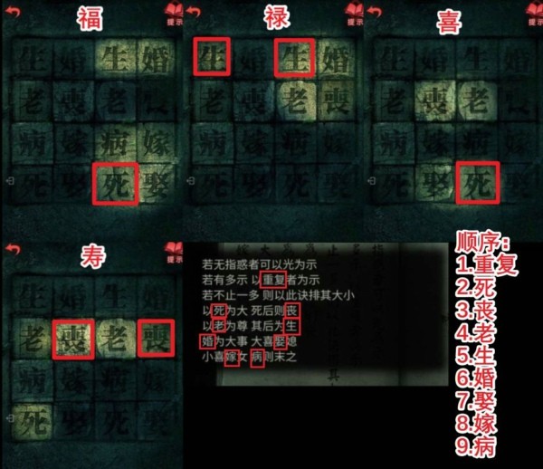 21、观察地板上的图案,得到密码线索(此处需要男主视角在上面切换“福禄寿喜”的地板,女主在地下观察地面灯光照到的文字变化,记住每个字对应的图案,根据《寿祭》中记载选择每个图对应的字,如图101):福-死、禄-生、喜-死、寿-丧。