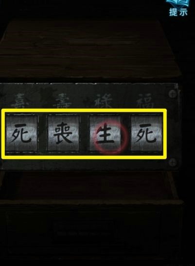 22、点击右边的柜子,使用密码:福-死、禄-生、喜-死、寿-丧,打开抽屉,得到【凿子】。