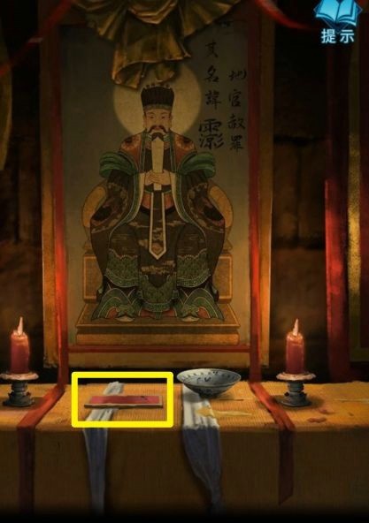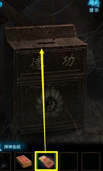34、来到庙中,点击左下角的功德箱,将【拜神金纸】投入功德箱,查看水官画像,得到【阳喜字】