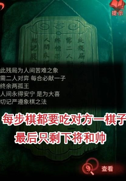 27、查看牌子上的下棋规则(黑棋拱卒吃马,红棋回士吃車,黑棋走马吃士,红棋移車吃马,黑棋拱卒吃車,红棋走帅吃马,黑棋动将吃兵,红棋走帅吃卒,最终只剩下将和帅)(只是个小游戏不是真的下棋,只有每步都吃对方一子,最后剩下将和帅就行)。