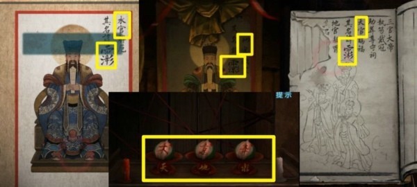 38、根据之前得到的线索(《名讳秘字》中天官名讳含“木”,地宫中画像显示地官名讳含“京”,寺庙功德箱中画像显示水官名字含“辛”),将寿桃上的字改为:天-木、地-京、水-辛(男主和女主视角的寿桃字都要)。