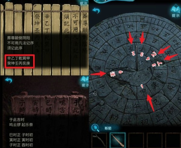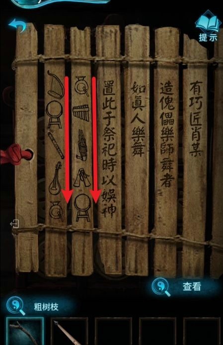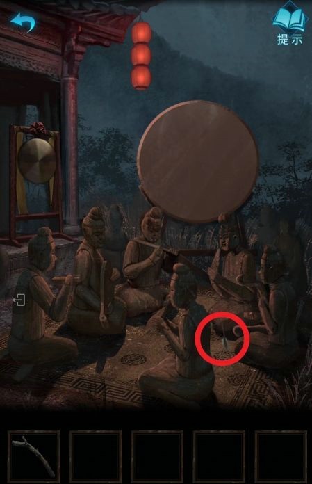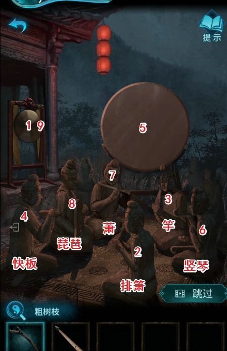 3.点击场景中间的架子,根据门口牌子上的内容与崖顶日晷的提示推理出架子上敲锣顺序(巳时正日晷上的刻度对应的是甲,子时初对应庚,则推算出敲锣顺序为【甲庚丁乙辛壬】),用粗树枝敲响锣。