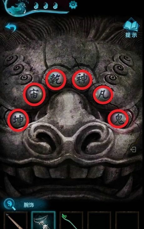 8.返回下方完成对话,回到戏台,点击戏台旁边石狮子头部,将盒子上文字:坤宙乾神凡鬼输入,打开旁边的石门,推动石门进入。