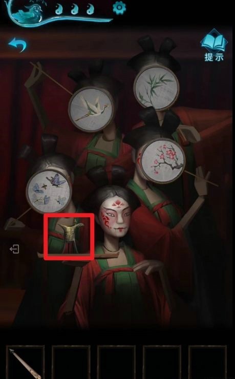 7.将酒倒在崖顶的大树旁,倒完酒就会出现盒子,回到戏台点击舞女的脸谱,将脸谱上的图形与扇子花纹一一对应,就能打开盒子,拿走【玉簪】。
