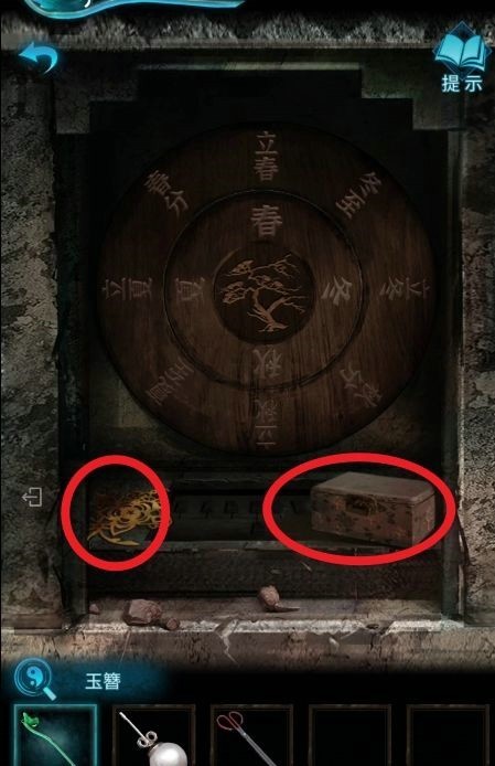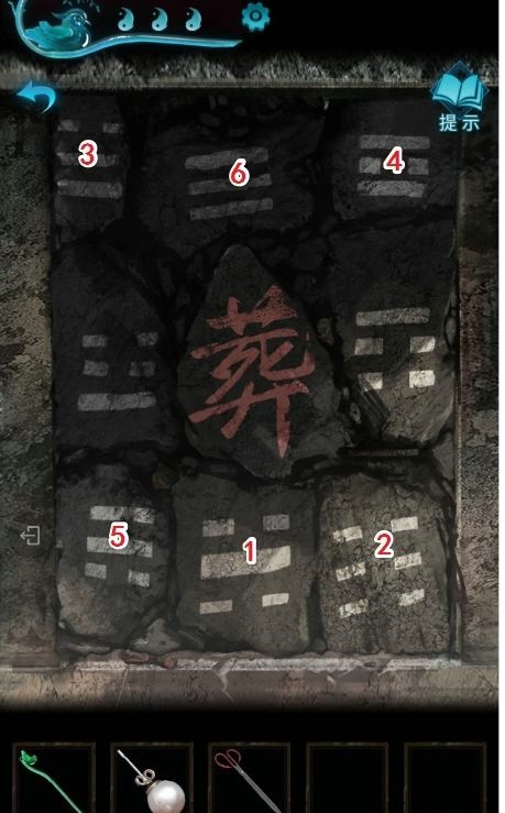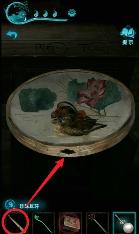 13.返回外屋,点击桌子,将得到的甲乙(甲乙图形线索在竹简下方的石头上)丙丁图形密码跟桌子上铜钱组合(甲图形为中间加上右侧的方格,代入铜钱可得出是唯,同理代入其他图形),按照灶台内甲乙颜色输入密码打开抽屉,得到【刺绣】,将【断箭】与【刺绣】组合成新道具【团扇】。