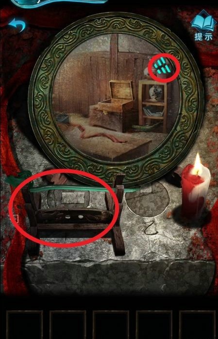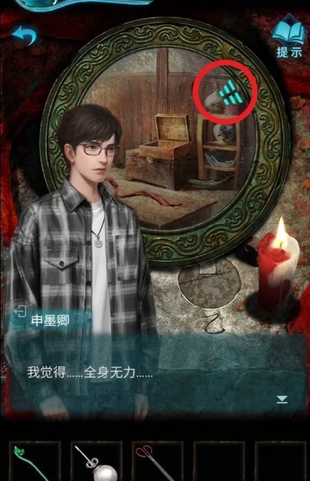15.返回车旁点击祭坛,将【古镜】放置在祭坛上,根据【古镜】提示的线索,将【杂色蜡烛】放在祭坛并点燃,古镜开始闪烁,将闪光符号记录下来。