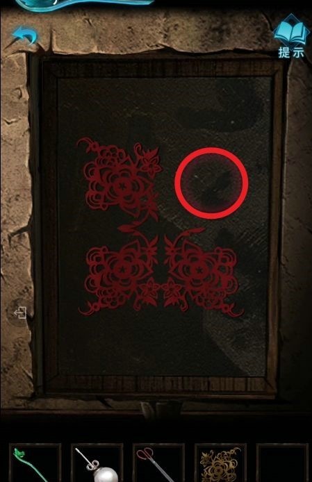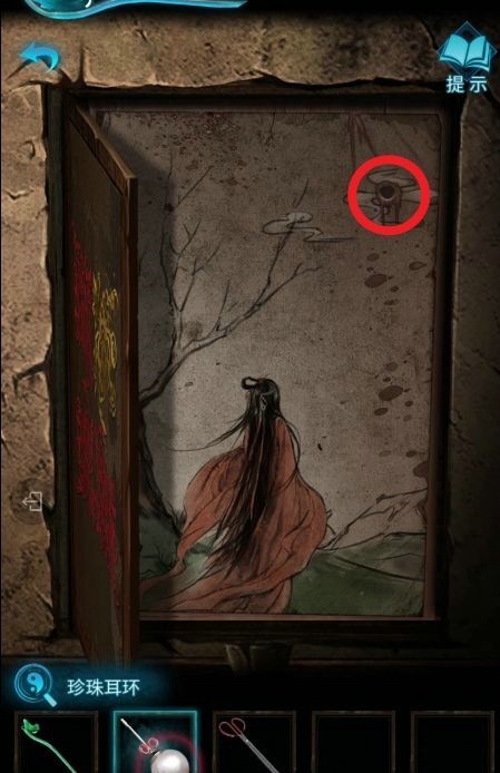 17.返回石洞处,用【小箱子】将石门顶住,进入屋内,将【金箔花】贴在窗户,窗户打开,将【珍珠耳环】放置在壁画右上方圆孔内。