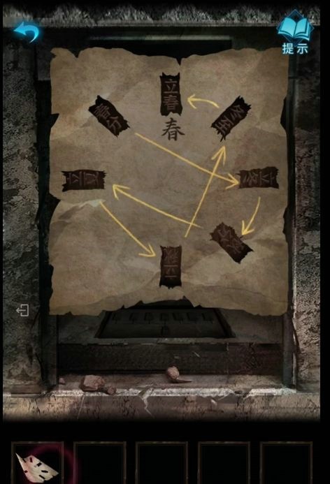 24.返回祭坛攀爬悬崖,前四次都会失败,爬上悬崖后,点击树下的神龛,将破洞的纸放在神龛中,根据破洞和指向得出暗号春分→立冬→秋分→立夏→立秋→冬至→立春。