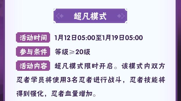 超凡模式限时开启,在这个模式中,双方使用3名忍者战斗,每名忍者的技能都有独特的技能强化,十分有意思。