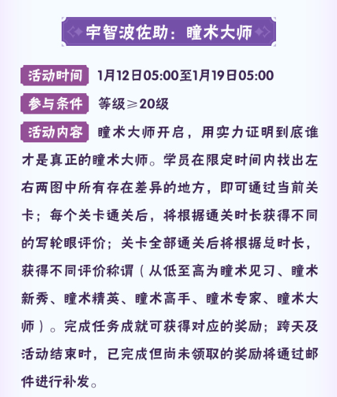 玩家在限定时间内找出左右两图中所有存在差异的地方,即可通过当前关卡。根据通关时长获得不同的写轮眼评价,关卡全部通关后将根据总时长,获得不同评价称谓。完成任务成就可获得对应的奖励。
