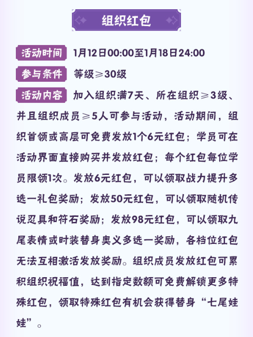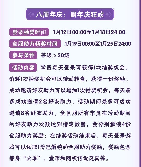 以上就是小编本期给各位玩家们带来的关于火影忍者手游八周年活动内容介绍的全部内容介绍了,还不知道八周年活动内容的玩家可以多看看上面的攻略,希望能帮到大家哦。小编在此会持续更新游戏攻略,我们下期再见!