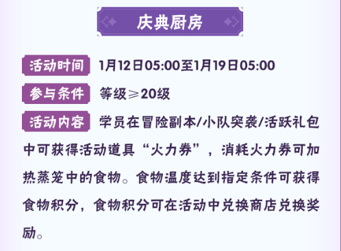玩家在冒险副本/小队突袭/活跃礼包中可获得活动道具“火力券”,消耗火力券可加热蒸笼中的食物。食物温度达到指定条件可获得食物积分,食物积分可在活动中兑换商店兑换奖励。