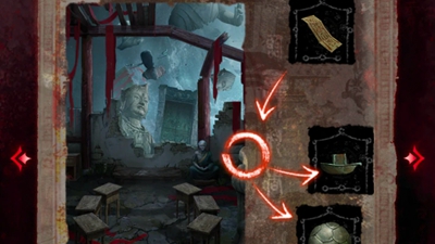 24、【女】将咒符贴到浊土寺中无面雕像的脸上,随后拾取小铜船和青铜球。